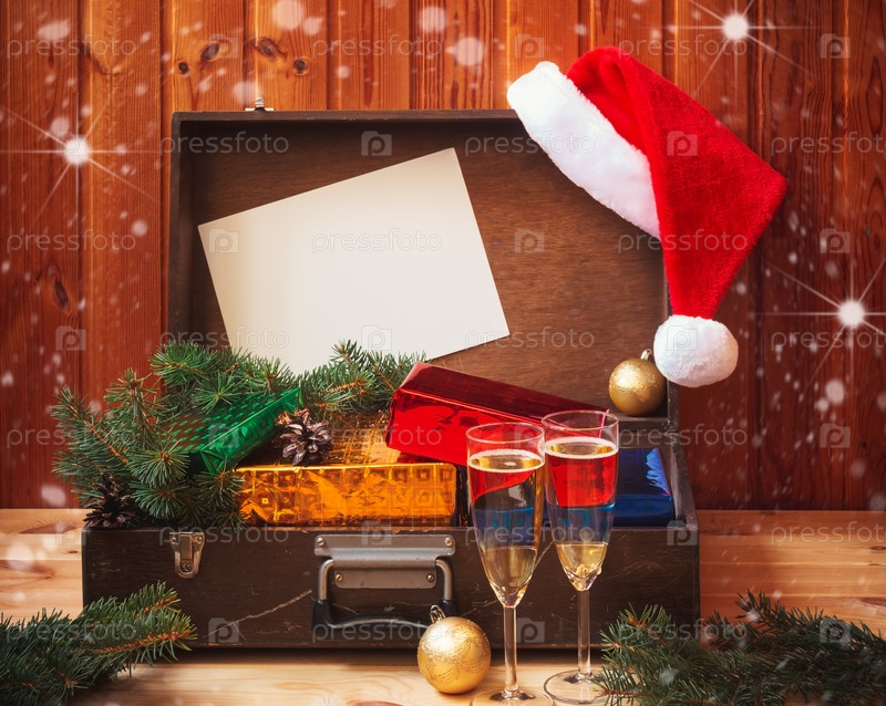 Винтажный чемодан с рождественскими подарками, пушистая шляпа Санты и пустая карточка для вашего текста. Два бокала шампанского впереди