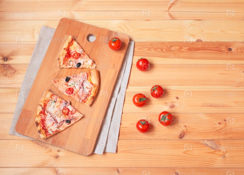 Кусочки вкусной пиццы из морепродуктов на разделочной доске. Свежие помидоры рядом