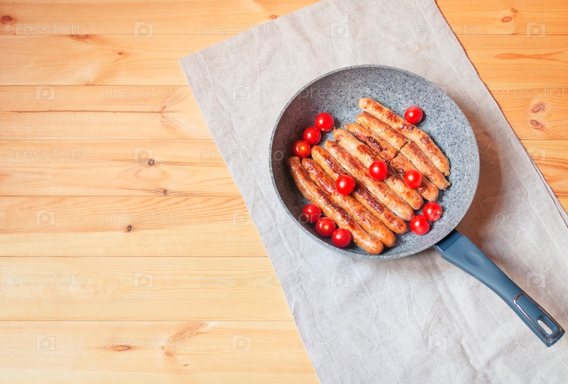 Жареные сосиски в сковороде на деревянном столе