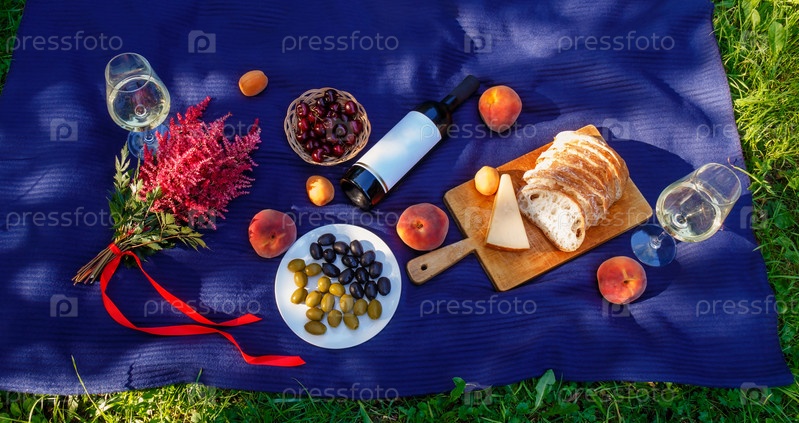 Место для пикника на открытом воздухе с красивым букетом, белым вином, хлебом, сыром и фруктами. Вид сверху
