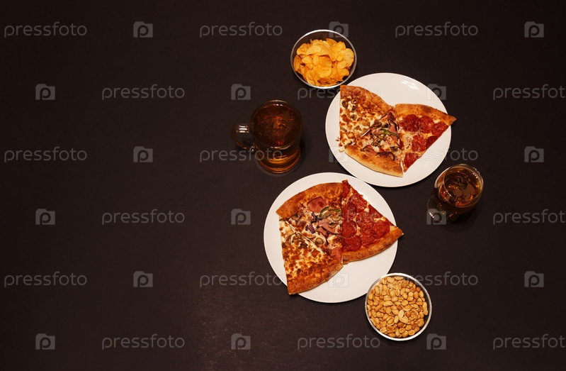 Кусочки пиццы пепперони, пиццы с ветчиной и куриной пиццы, стакан пива, кружка пива, арахис и картофельные чипсы. Вид сверху