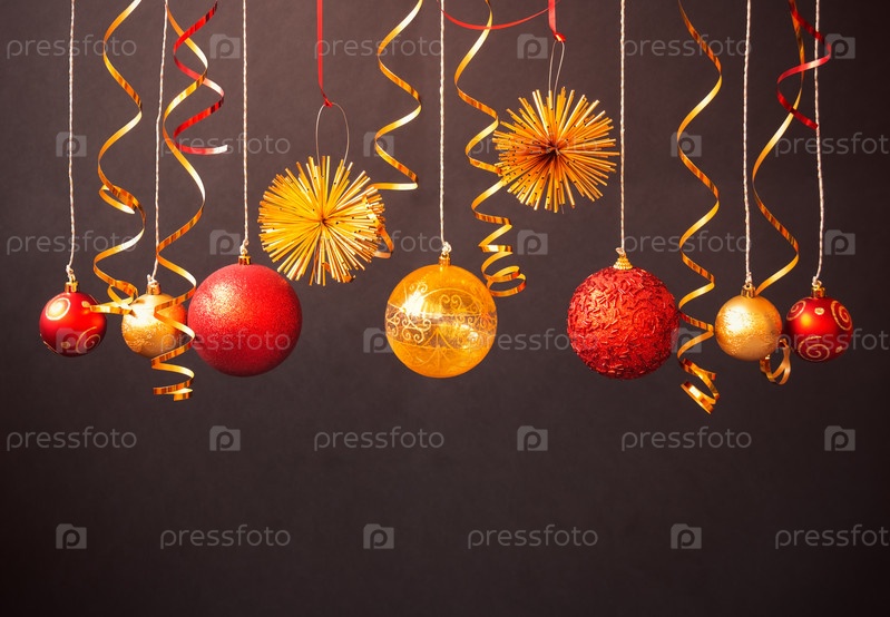 Красные и золотые рождественские украшения висят на темном фоне