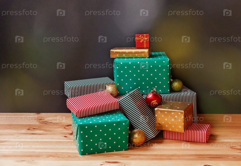 Красочные подарки и новогодние шары на темном фоне