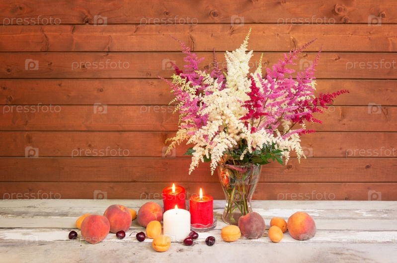 Белые, красные и розовые красивые цветы астильбы в стеклянной вазе, горящие свечи и свежие фрукты рядом со старым деревянным столом