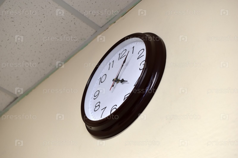 Черные круглые часы с белым циферблатом на светлой стене