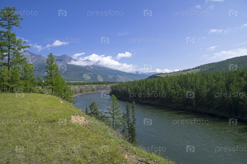 Вид с высокого обрывистого берега реки Оки Саянской в сторону гор. Бурятия, Сибирь, солнечный день в августе
