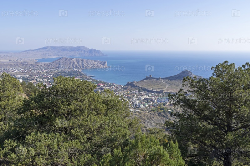 Вид на курортный город Судак со склона горы Перчем. Крым, солнечный день в октябре