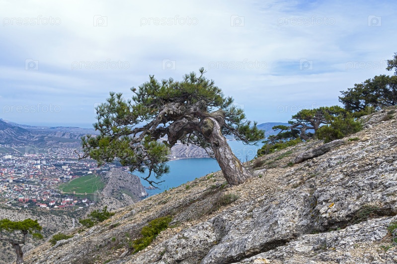 Рекликтовая сосна с сильно изогнутым и скрученным стволом. Гора Сокол, Побережье Черного моря между Судаком и Новым Светом. Крым