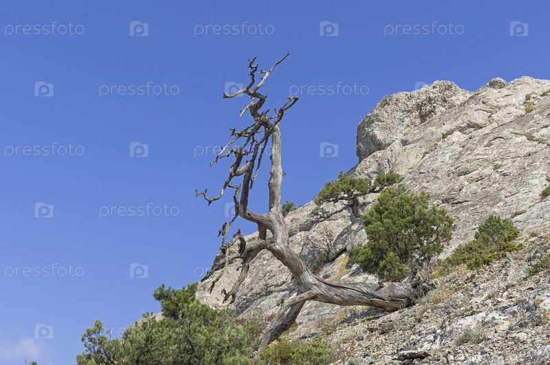 Ветви мертвой реликтовой сосны на фоне безоблачного синего неба. Гора Сокол, Крым, солнечный день в октябре