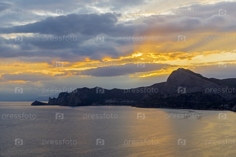 Закат солнца на черноморском побережье Крыма. Вид с вершины мыса Алчак на запад, в сторону Нового Света