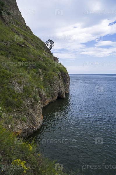 Опасное место на Большой Байкальской Тропе, известное как "Чертов Мост". Тропа проходит по крутому обрывистому скальному склону. Прибайкальский национальный парк, Иркутская область. Август