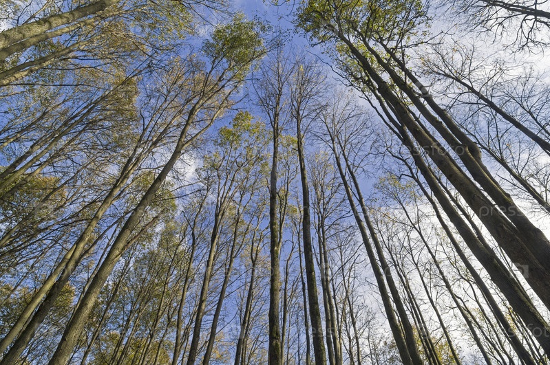 Стволы осин с наполовину облетевшими листьями на фоне неба. Начало октября