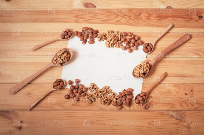 Фундук, грецкие орехи и миндаль в деревянных ложках и рядом с пустой карточкой для вашего текста на деревянном столе
