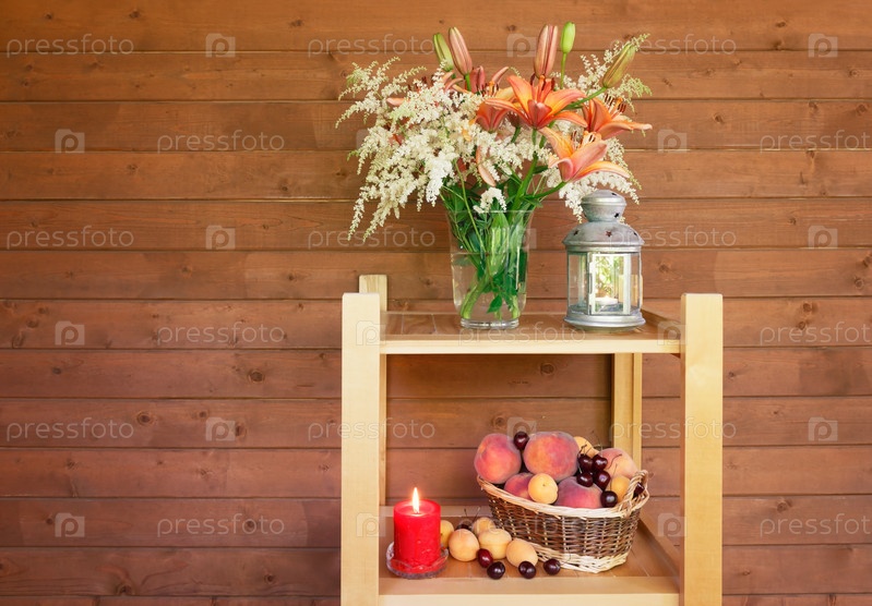 Лилии и цветы астильбы, горящий фонарь, свеча и плетеная корзина с фруктами стоят на деревянных полках