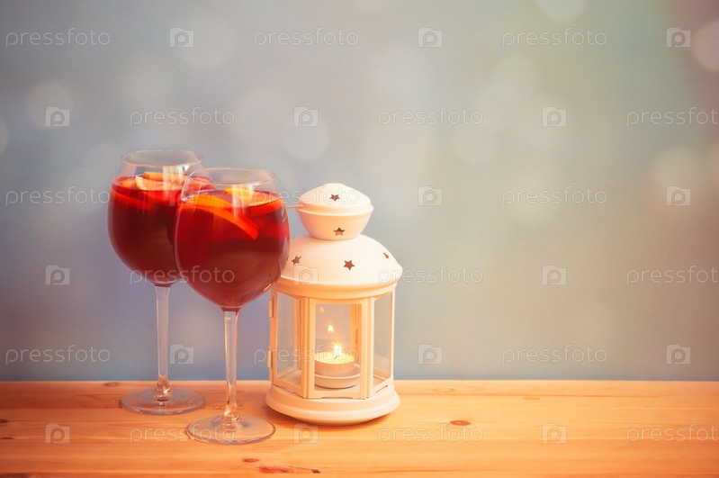 Горящий фонарь и сангрия из красного вина с фруктами в стаканах на деревянном столе