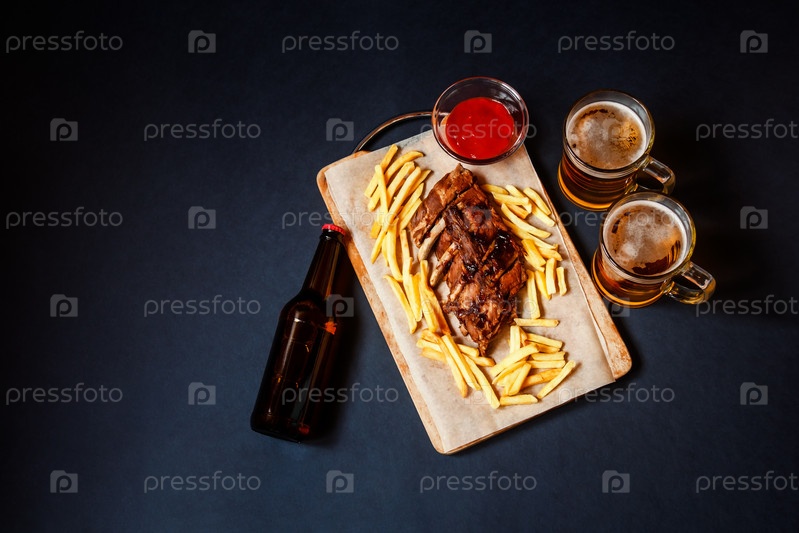 Запеченные свиные ребрышки с картофелем фри на разделочной доске и пивом. Вид сверху, пространство для копирования