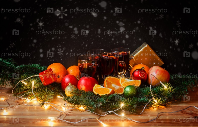 Стаканы глинтвейна, яблоки, апельсины, елочные шары, подарки, еловые ветки и светящиеся рождественские огни. Выборочный фокус