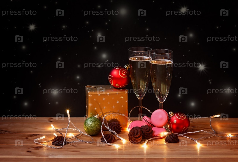 Бокалы с шампанским, рождественский подарок, шарики, клубничное миндальное печенье, шоколадное печенье и светящиеся рождественские огни на темном фоне