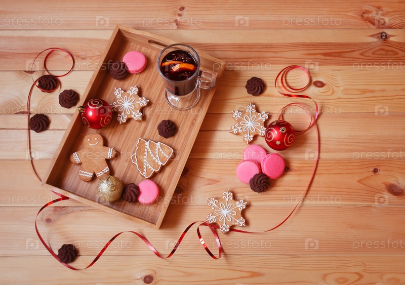 Стакан глинтвейна, рождественские пряники, шарики, клубничное миндальное печенье и шоколадное печенье на деревянном столе
