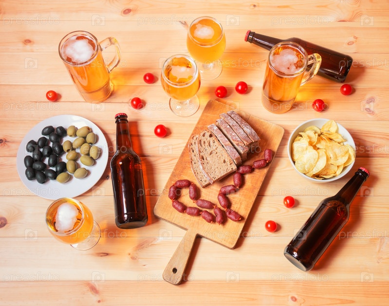 Пиво, оливки, картофельные чипсы, хлеб и маленькие колбаски чоризо на деревянном столе. Вид сверху