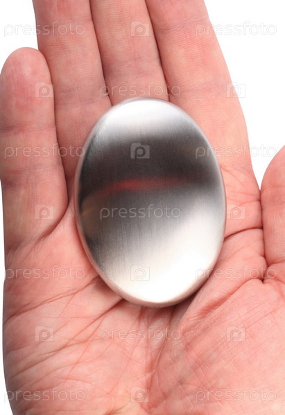 Рука с мылом из нержавеющей стали на белом фоне