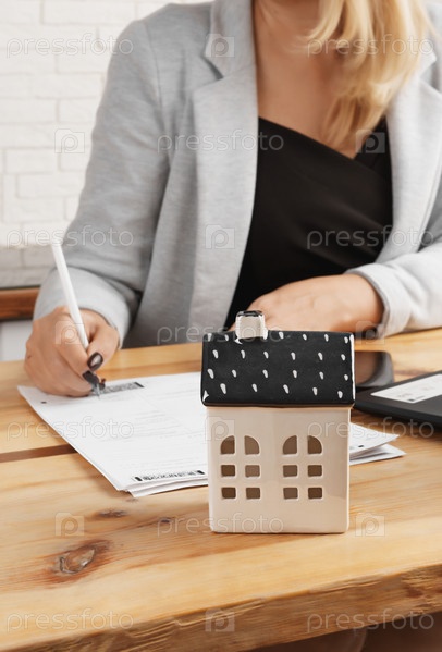 Бизнес-леди подписывает документы на фоне модели дома на фоне кухонной мебели
