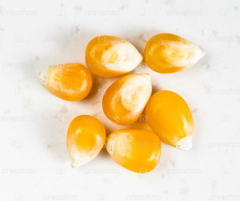Несколько сырых кукурузных зерен крупным планом на сером
