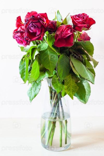 Вид сбоку на букет увядших красных роз в вазе