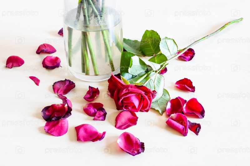 Увядший цветок красной розы и опавшие лепестки возле вазы