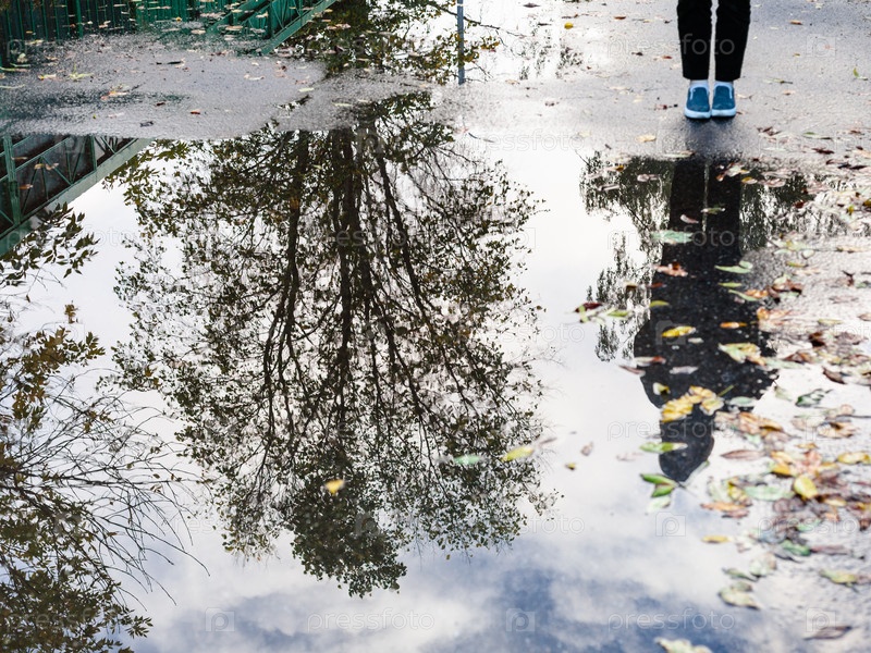 Подросток возле дождевой лужи с отражением на дереве