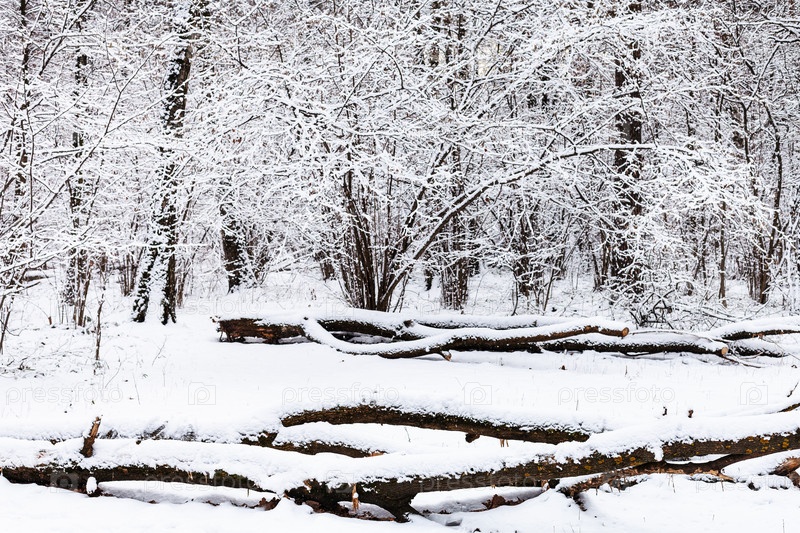 Заснеженные упавшие деревья на поляне в снежном лесу