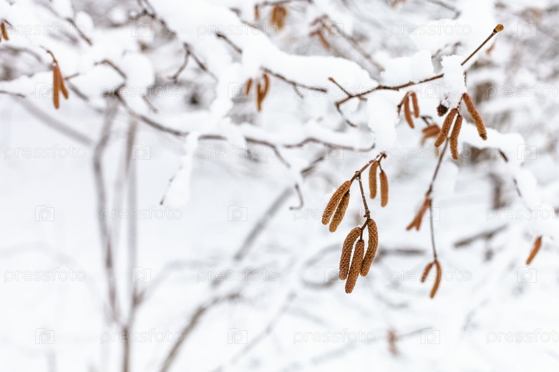 Сережки ольхи крупным планом в заснеженном лесу