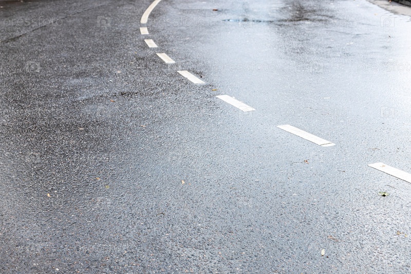 Мокрая поверхность двухполосной дороги после осеннего дождя