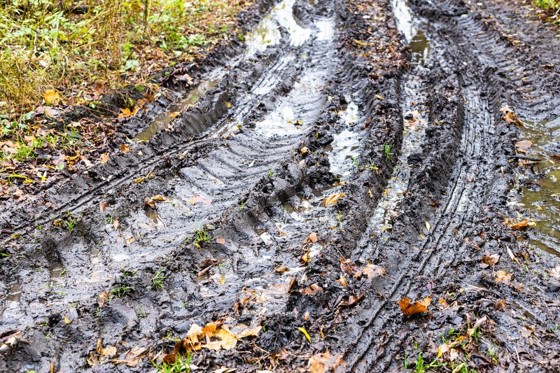 Грязная проселочная дорога с дождевыми лужами осенью
