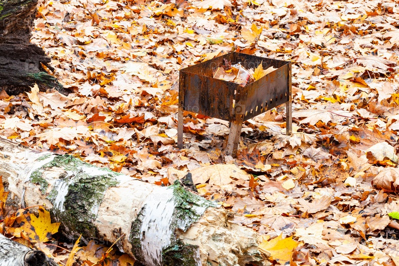 Заброшенный гриль на лугу, покрытом опавшими листьями