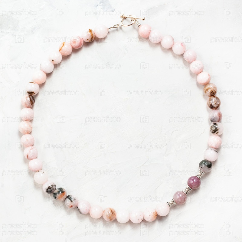 Ожерелье из бусин розового кварца на сером фоне