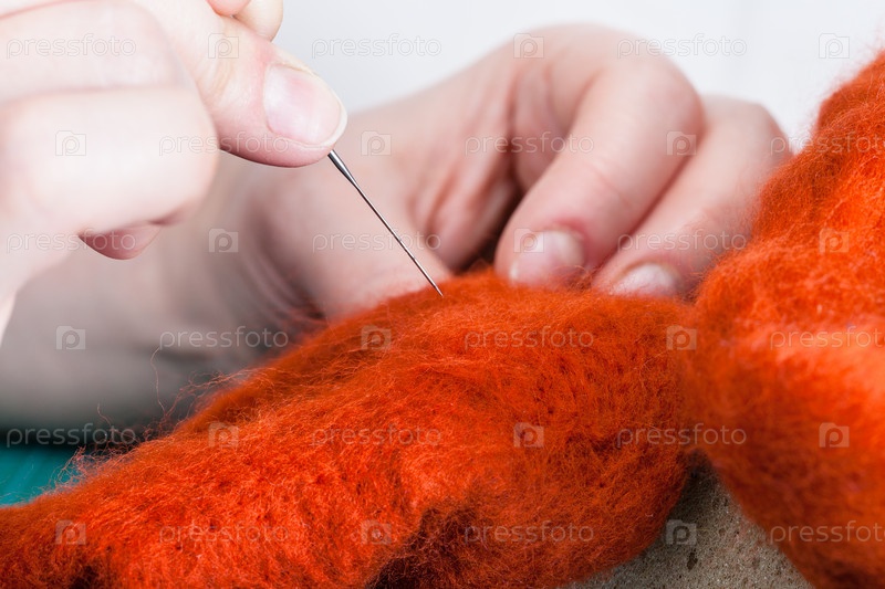 Мастер связывает войлочную ткань иглой для валяния
