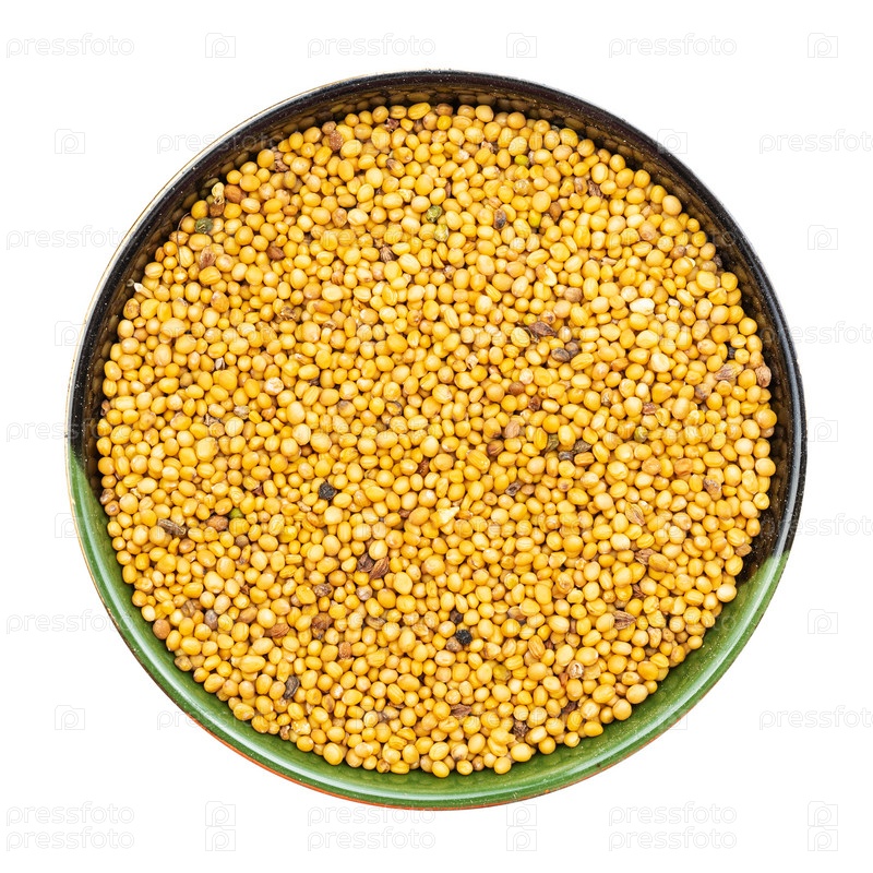 Желтые семена горчицы в круглой миске изолированы