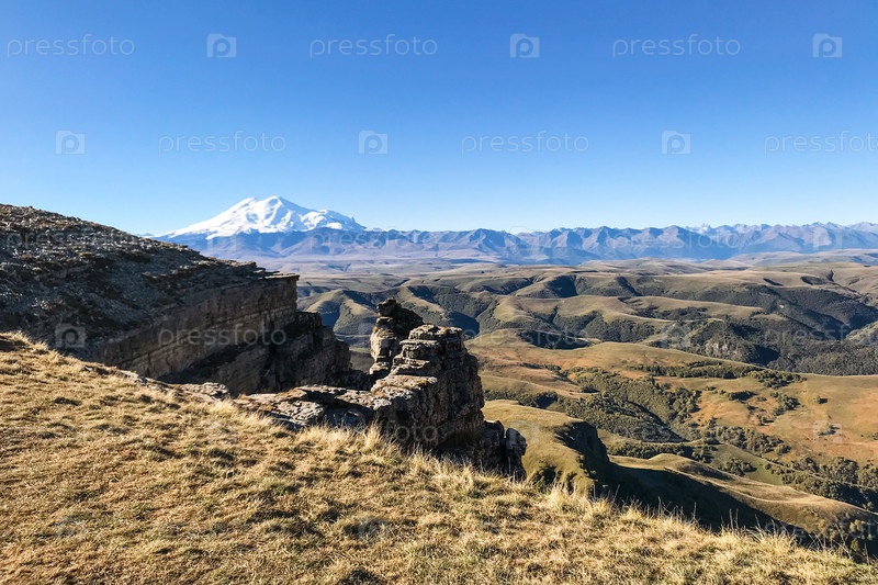 Скала плато Бермамыт и вид на гору Эльбрус