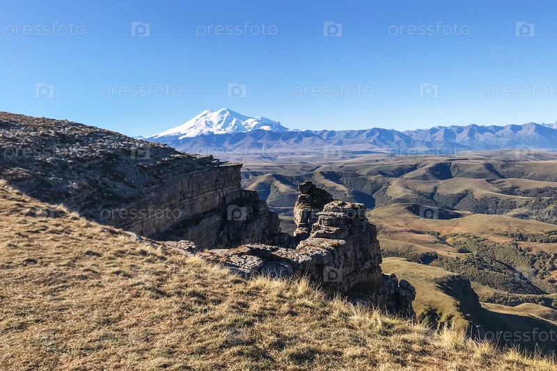 Скалы плато Бермамыт и вид на гору Эльбрус