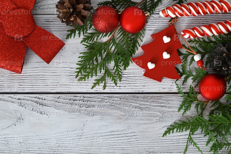 Рождественская открытка с игрушками, еловыми ветками и гирляндой. Декор сладостями, корицей