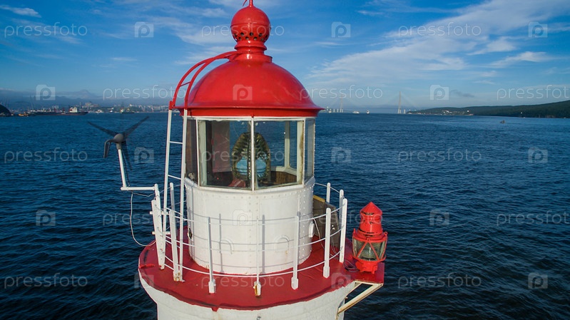 Аэрофотосъемка морского пейзажа с видом на знаменитый Токаревский маяк. Владивосток, Россия