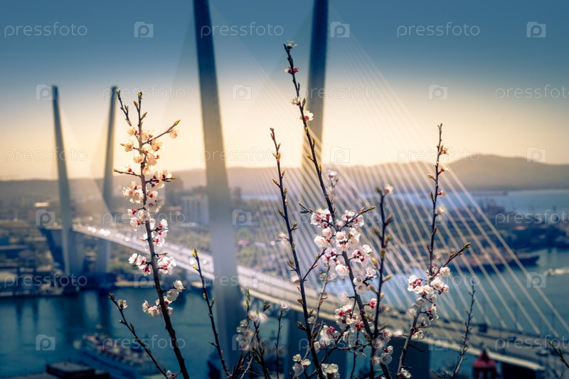 Цветущие вишневые ветки на размытом фоне Золотого моста