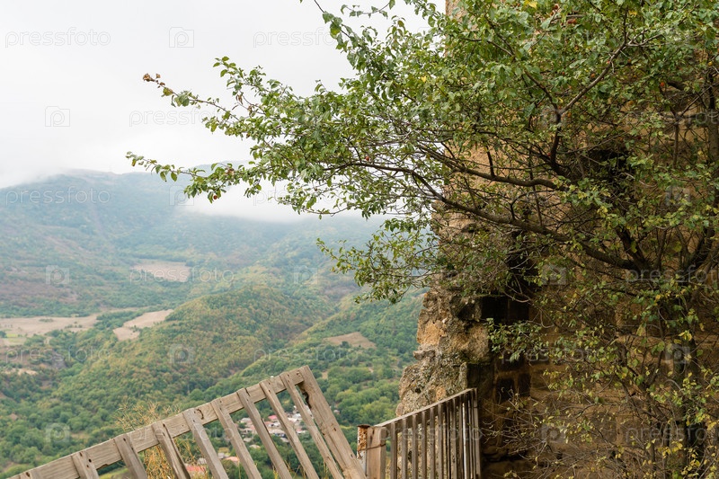 Фрагмент стены старого монастыря в Армении и вид на горы