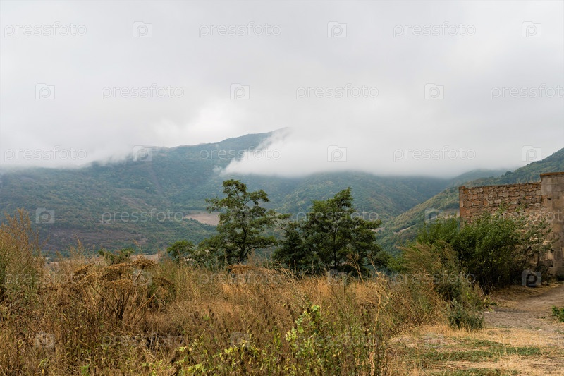 Армянский туманный горный пейзаж с желтой травой и деревьями