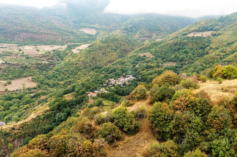 Осенний вид на деревню среди Кавказских гор, Армения