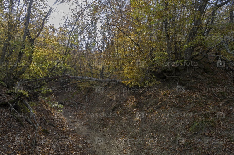 Тропа в небольшом горном ущелье. Окрестности курортного поселка Новый Свет. Солнечный день в октябре