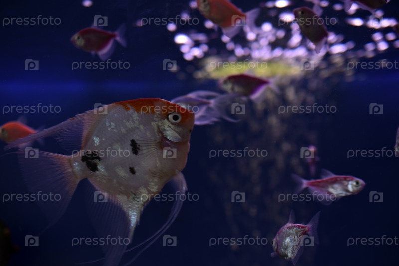 Красивые аквариумные рыбки скалярии в чистой воде с водорослями. Род рыб семейства цихлид. Аквариумные рыбки в домашних условиях