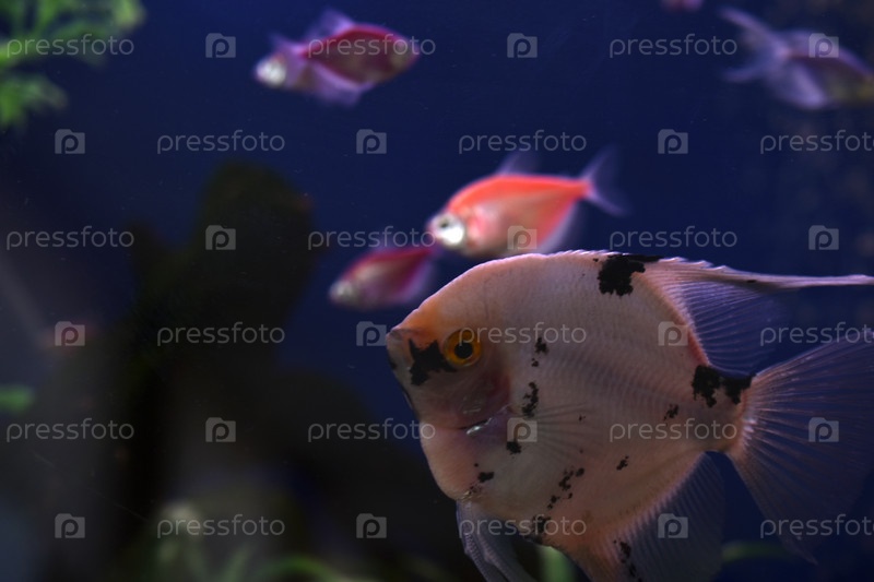 Красивые аквариумные рыбки скалярии в чистой воде с водорослями. Род рыб семейства цихлид. Аквариумные рыбки в домашних условиях