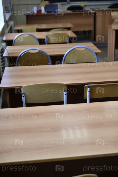 Школьные принадлежности. Концепция образования. Школьные парты и стулья в классе ученика в школе